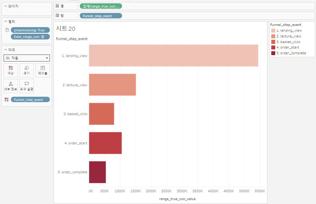 ① 열에 측정값, 행과 색상에 순서가 부여된 퍼널 이름(Funnel_step_event) 삽입