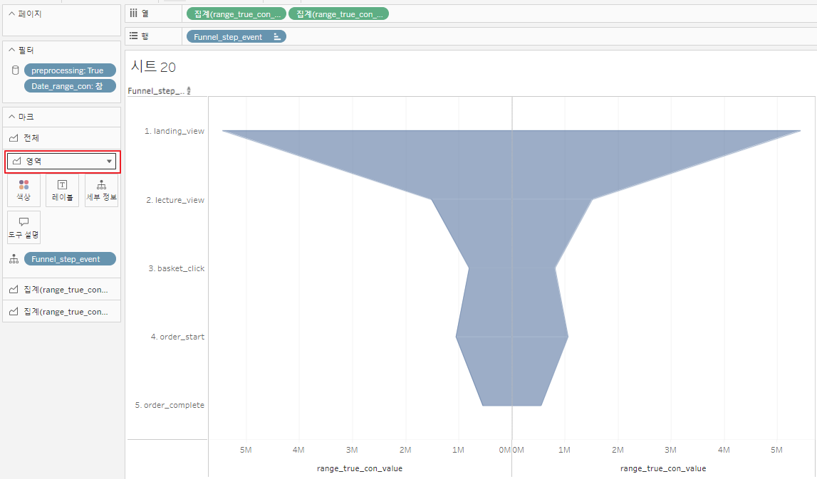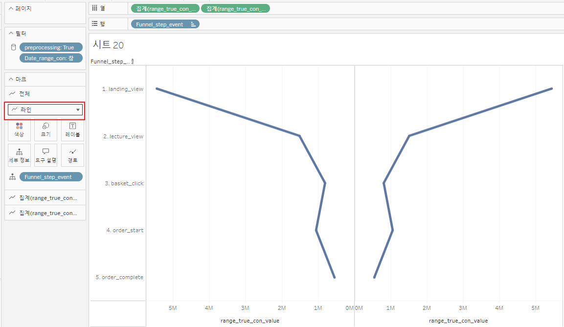 ② 마크 크기를 키워서 퍼널 모양을 만들고, 열에 측정값을 복사하여 그래프 1개 더 만들기