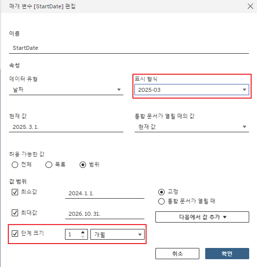 (시도) 매개 변수 생성 시 값 범위의 단계 크기를 [1 개월]로만 설정