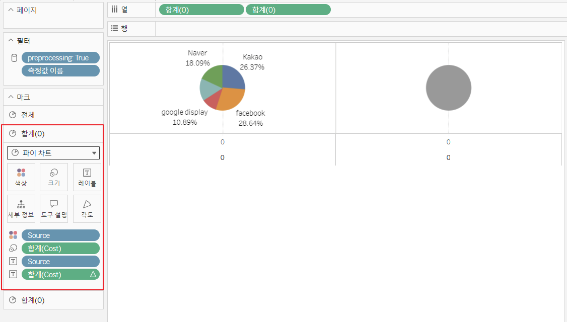 ② 마크 > 파이차트 선택 후 좌측 파이차트에 값 추가: 차원(소스) - 색상, 레이블 / 측정값 (비용) - 크기, 레이블(구성비율)