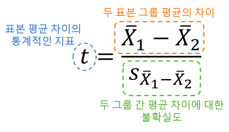 - t-score는 두 그룹 간의 평균 차이를 합동 표준 편차(표준 오차)로 나눈 값