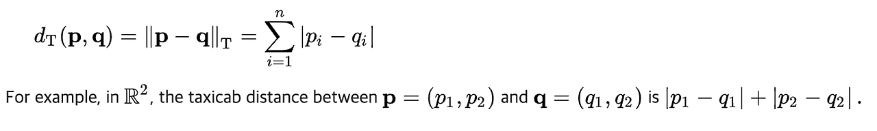 - 2차원에서는 '맨해튼 거리 = X축 사이의 차이 + Y축 사이의 차이'