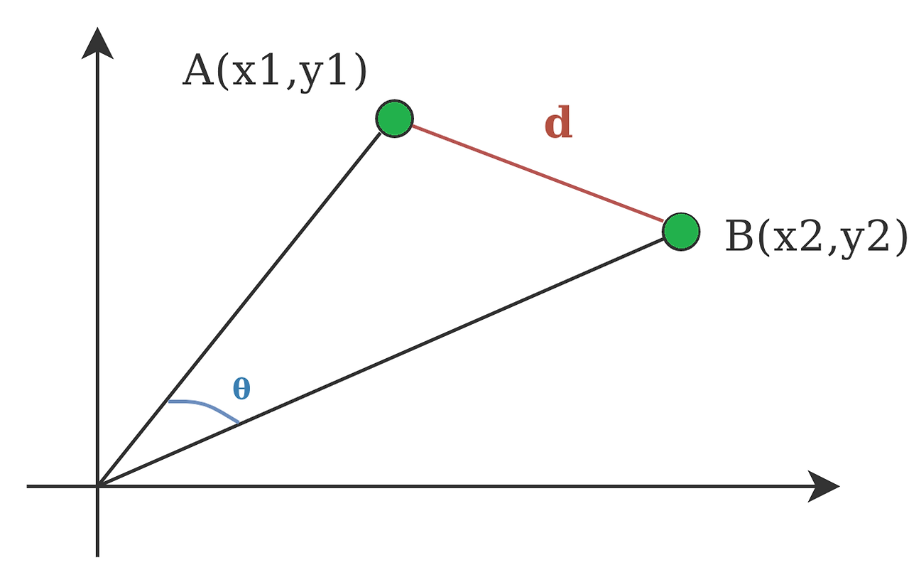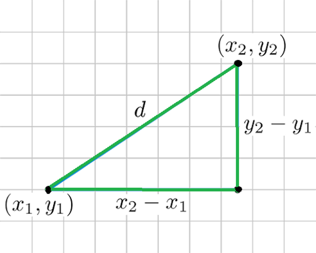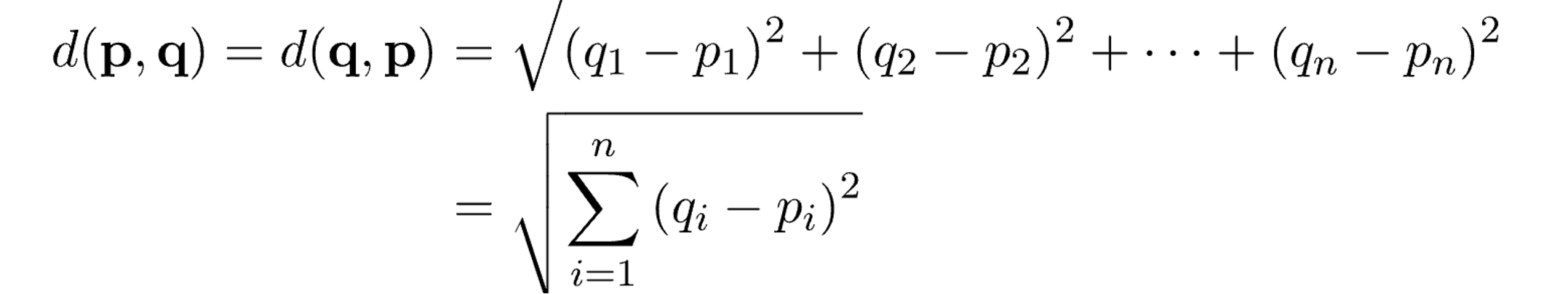 - 일반적으로 가장 익숙한 거리 계산식으로 피타고라스 거리, 직선 거리로도 불림