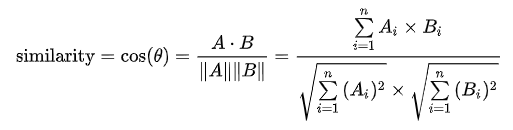 # 코사인 유사도 = (차원1 * 차원2)의 총합 / 차원1 제곱 총합의 제곱근 * 차원2 제곱 총합의 제곱근