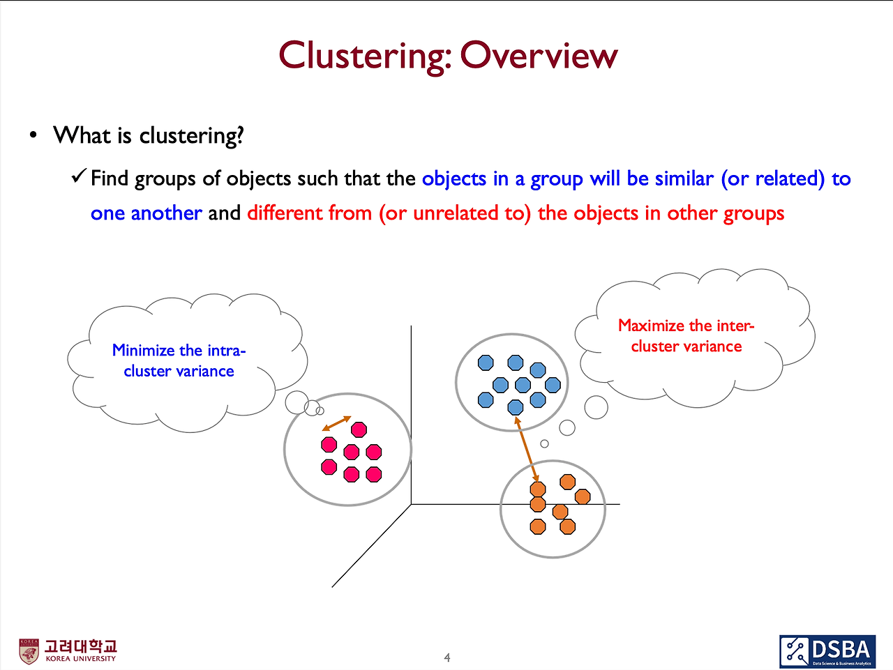 - 데이터 분석 기법에서 클러스터링은 분석 대상이 되는 데이터의 그룹을 만드는 방법론