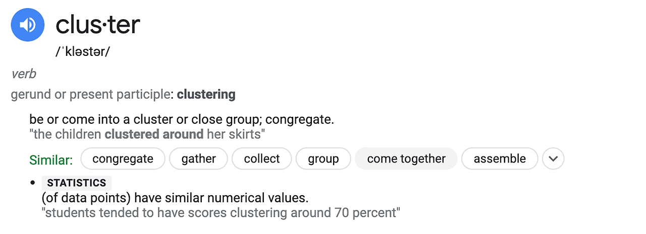 - 사전적으로 클러스터링(Clustering)은 서로 가까이 있는 비슷한 것들의 그룹(군집)을 이루는 작업