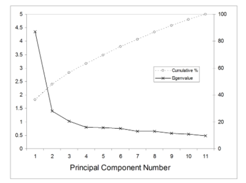 * 가로축을 차원의 갯수, 세로축을 고유값(eigenvalue, 얼만큼의 분산을 가지고 있는지)으로 만든 plot