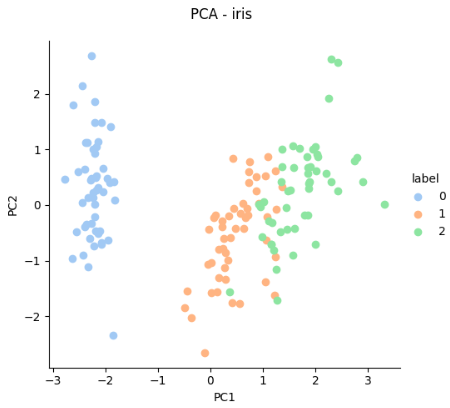 df_iris_pca = pd.DataFrame(data=pca.fit_transform(df_iris_s), columns=['pc1', 'pc2'])