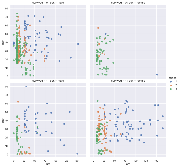 facet = facet.map(sns.regplot, 'fare', 'age', fit_reg=False)