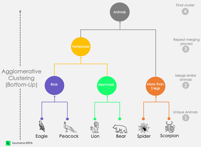 - 각각의 데이터를 하나의 군집으로 여기고, bottom-up으로 묶어나가는 방식