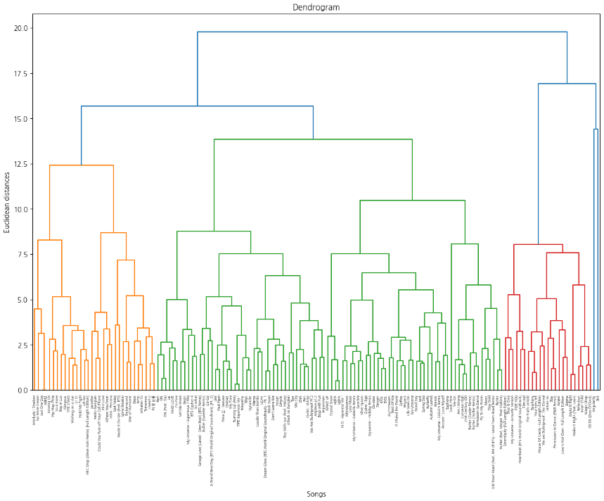 cluster_song[label].append(df_bts_h_clustering['Title'][idx]) # value를 [] 처리해뒀으니 거기다 title 하나씩 넣기
