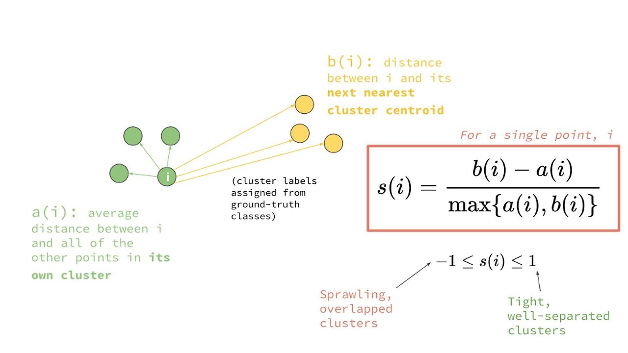 - b(i) : i가 속한 군집과 거리가 가장 가까운 군집에 속한 데이터 포인트들과 i 사이의 거리 평균
