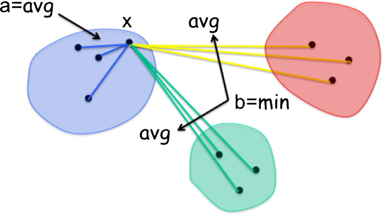 ② 데이터 포인트 i 에 대한 실루엣 계수 s(i)는 위 그림 속 식으로 계산