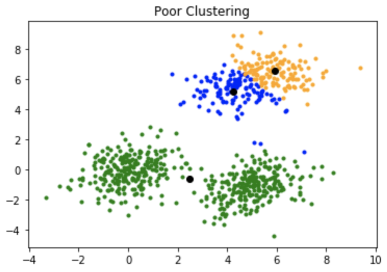 - 문제: 초기 Centroid가 데이터 분포를 무시한 채 할당되면 좋지 않은 클러스터링 결과가 나올 수 있음