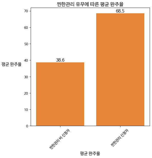 plt.title('찐한관리 유무에 따른 평균 완주율',fontsize=14) plt.xlabel('평균 완주율',fontsize=12) plt.xticks([0,1], labels=["찐한관리 비 신청자","찐한관리 신청자"]) plt.ylabel('찐한관리 여부',fontsize=12,rotation=360,labelpad=35) plt.xticks(rotation=45) plt.yticks(rotation=360) plt.show()