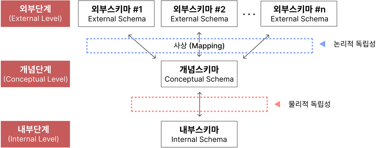 : 각 단계에 따라 논리적 독립성(외부 스키마 ↔ 개념 스키마)과 물리적 독립성 (개념 스키마 ↔ 내부 스키마)이 있음