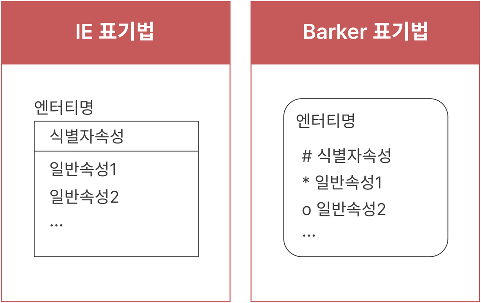 * IE는 네모 박스로, Barker는 특수문자로 표기 (# 식별자, * 필수속성, o 선택속성 등)