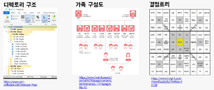 - 트리의 활용: 컴퓨터 OS 디렉토리 구조, 조직의 계측도, 결정트리, DB데이터 검색 등
