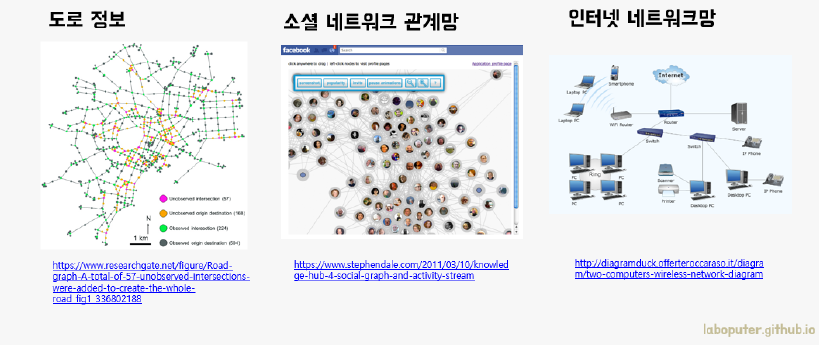 - 그래프의 활용: 도로정보(최단 경로 탐색), 소셜 네트워크 관계망(인간관계 분석), 인터넷 네트워크망(전송 속도) 등