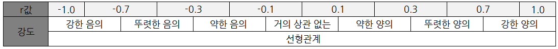 └ 무상관 관계: 0에 가까울수록 선형관계가 거의 없거나 약한 관계