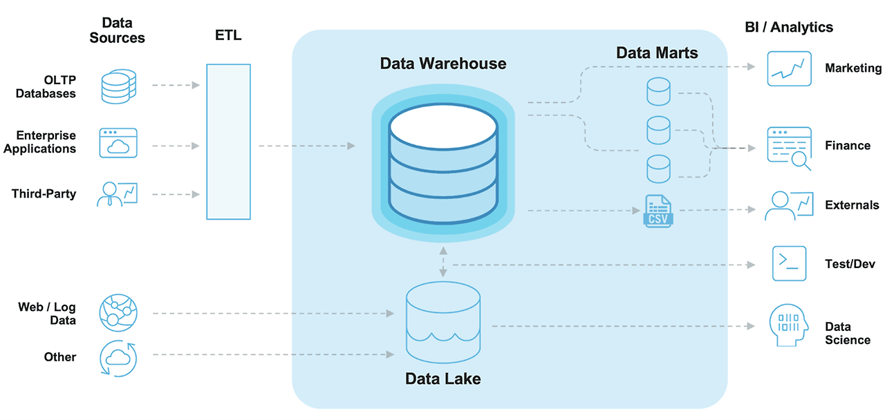 ④ Data Marts: 회사의 금융, 마케팅, 영업 부서와 같이 특정 조직의 목적을 위해 가공된 데이터
