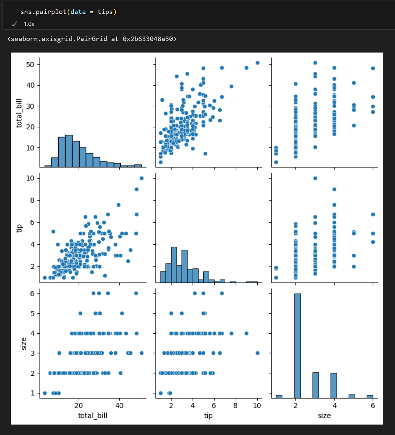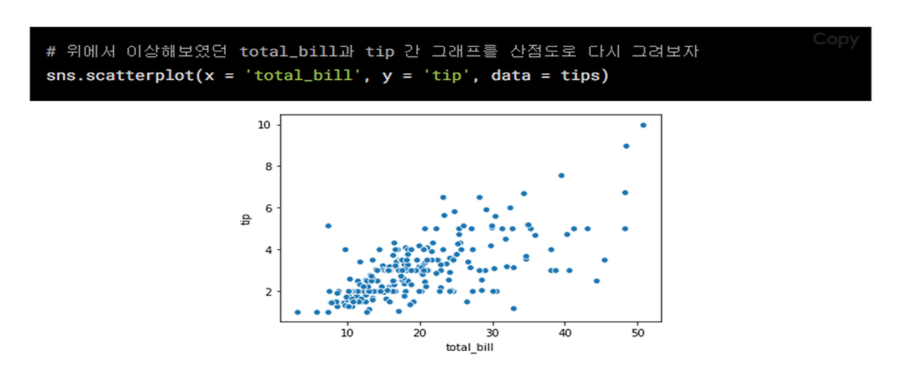 - 방법: 두 연속형 변수간의 관계를 시각적으로 파악하고 싶을 때 ex. 키와 몸무게 간의 관계