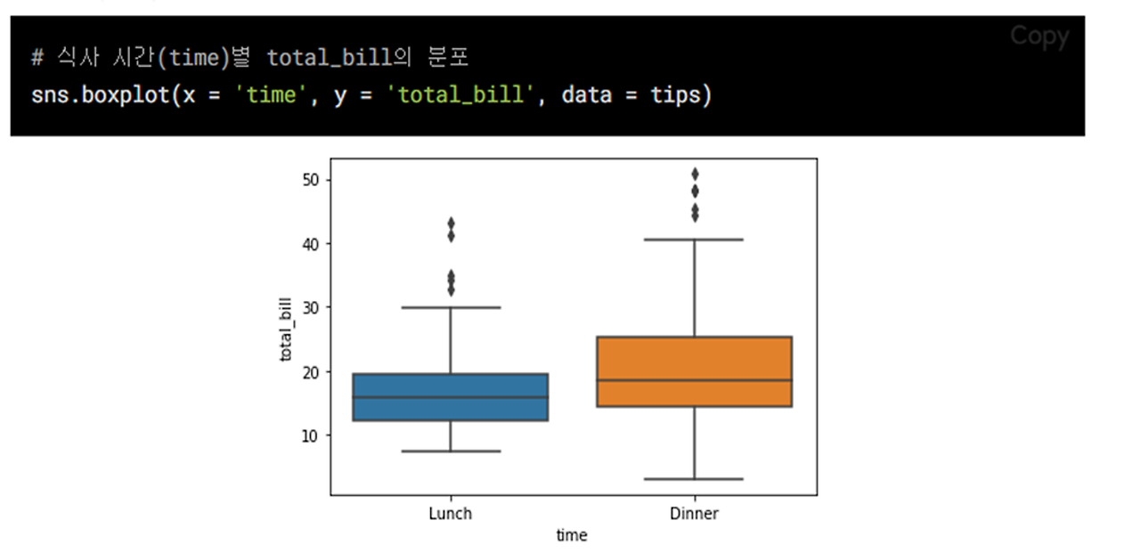 - 방법: 데이터의 분포, 중앙값, 사분위 수, 이상치 등을 한눈에 표현하고 싶을 때 ex. 그룹간 시험 점수 분포 비교