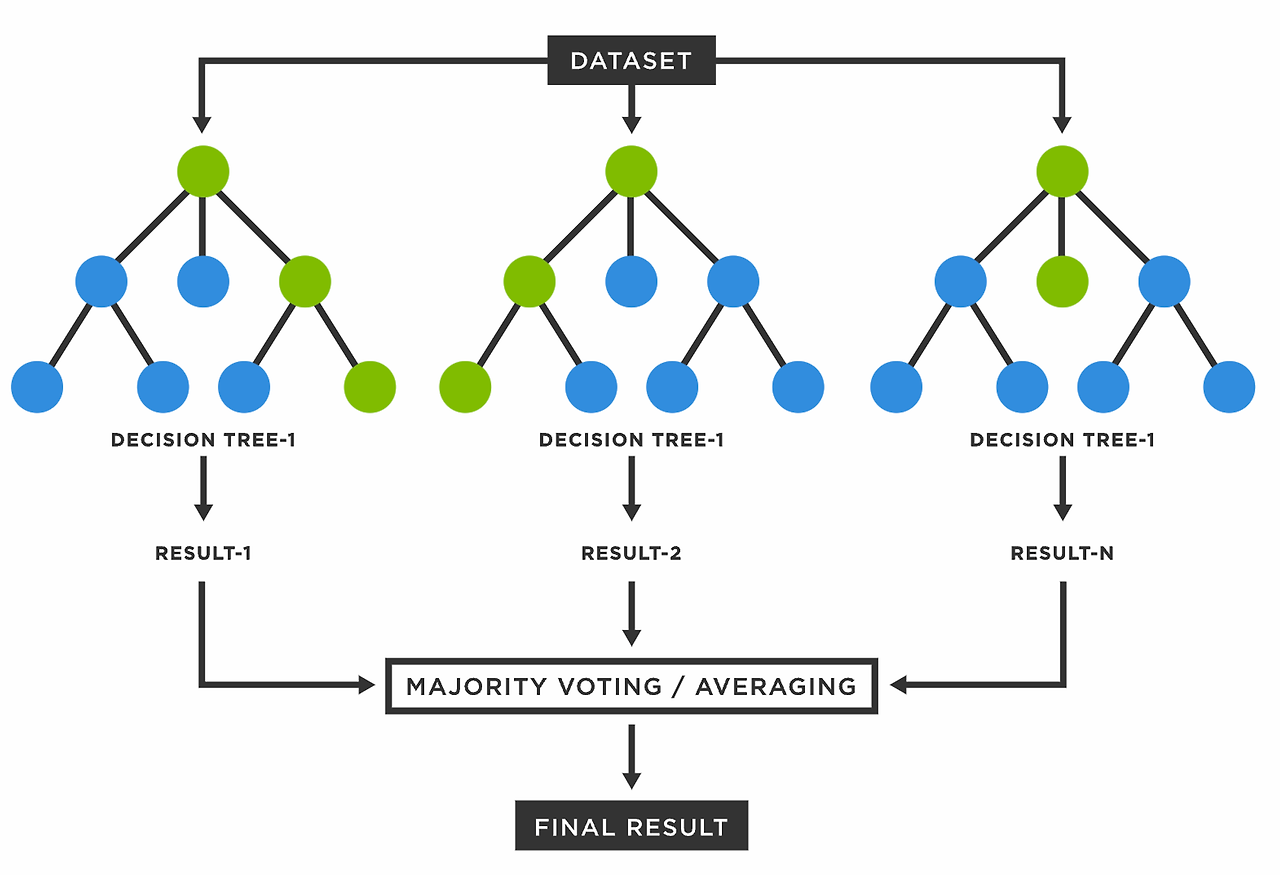 └ 여러 개의 데이터 샘플에서 각자 의사결정트리를 만들어서 다수결 법칙에 따라 결론을 냄