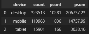 device_df.columns = ['device', 'count', 'pcont', 'psum']