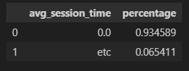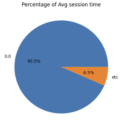 └ 평균세션시간이 0인 비중이 94%, 나머지 시간은 각 비중이 현저히 낮아 특정 기준 이하 값은 합계하여 '기타' 항목 처리