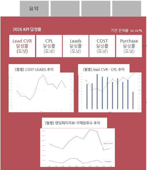 - 2026년 메인 KPI는 lead CVR 4.34%, CPL 18,434원, 서브 KPI는 구매 완료 수 434,520건
