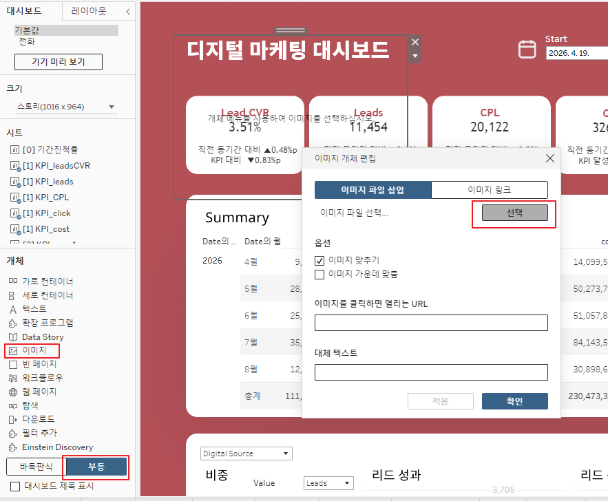 - 대시보드 > 부동 > 개체 - 이미지 > 이미지 파일 삽입 > 배경 삽입 후 위치에 맞춰 각 워크시트 부동으로 배치