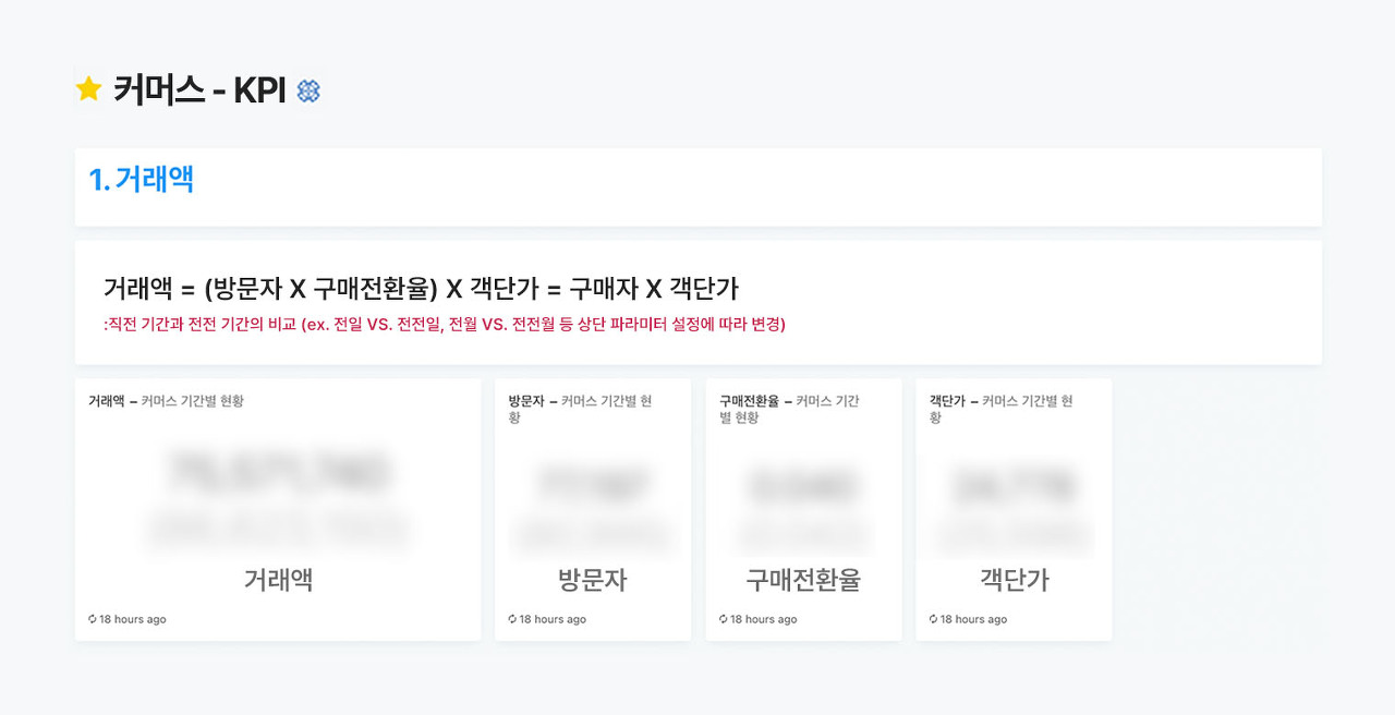 지표 간 관계의 이해를 넘어, 분석 흐름에 따라 지표의 현재 수준을 확인할 수 있도록 대시보드를 설계했다. 대시보드에서 최상위 문제를 발견하면, 각 지표와 관련된 하위 지표들이 구성된 분석 대시보드에서 문제의 원인을 짐작할 수 있다. 대시보드만 보면 지표의 변동과 원인 파악이 쉽고 빠르게 가능해진다.