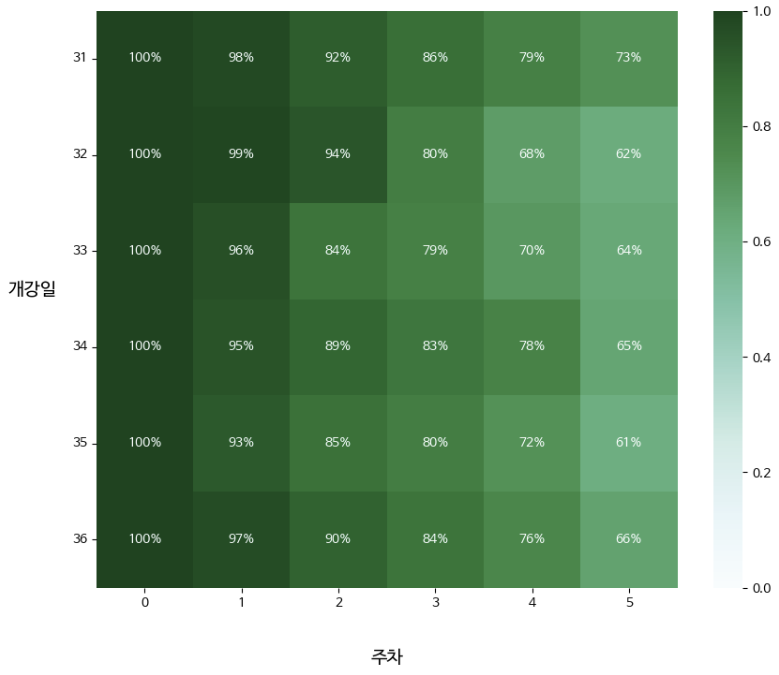 # 최초 수강생 수를 각 데이터에 나눠주기 retention = cohort_counts.divide(cohort_sizes, axis=0)