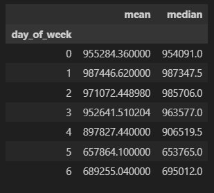 push_count_by_dow = df.groupby('day_of_week')['push_count'].agg(['mean', 'median'])